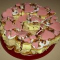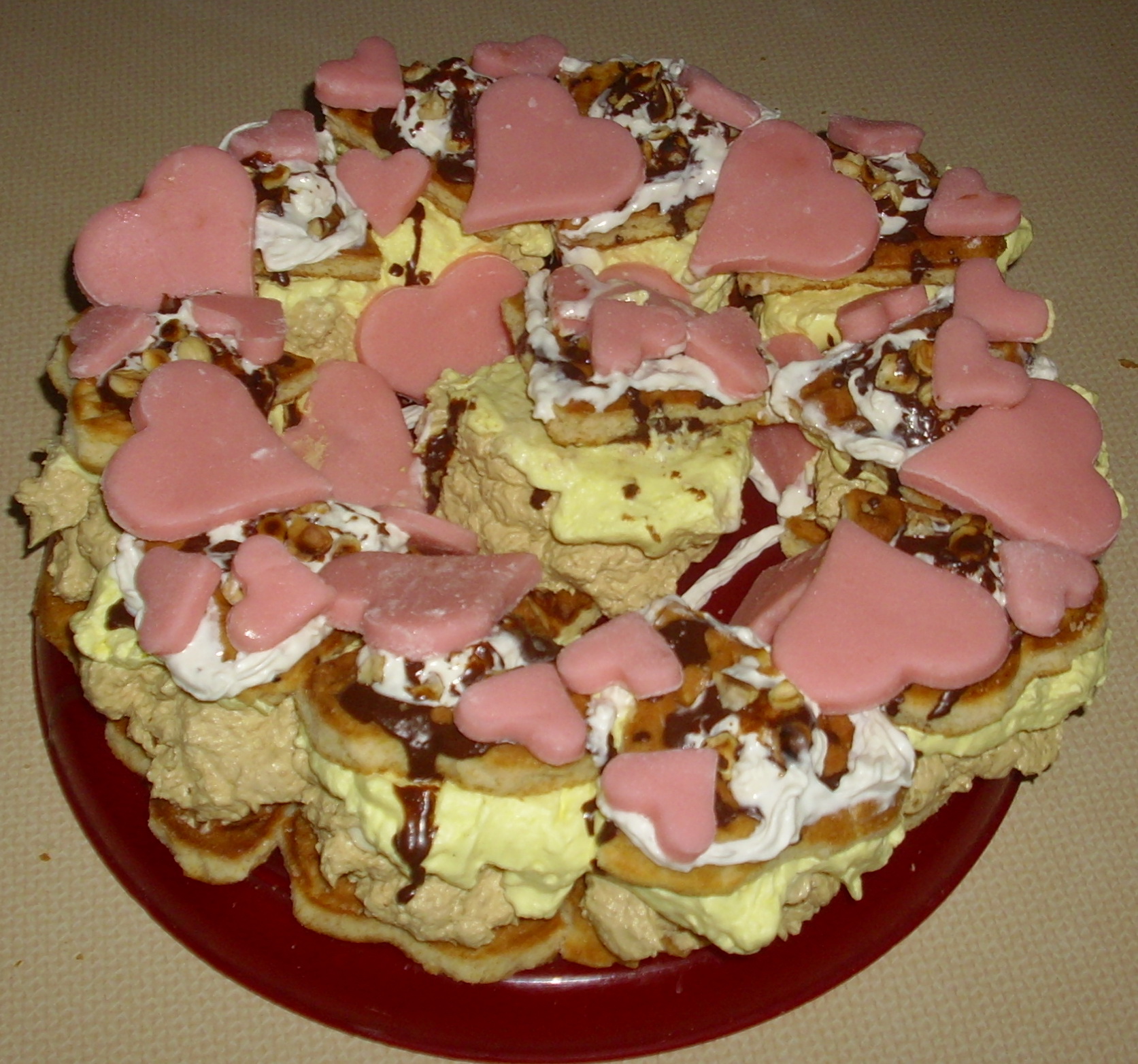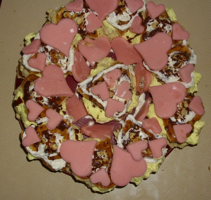 Priprema poslastice: Poređati 10 komada bakinih kolača da čine jedan zatvoreni krug, a jedan staviti u sredinu. Skuvati puding od karamele i ostalih sastojaka i pošto se ohladi umutiti ga sa margarinom. Dobijeni fil bogato naneti na svaki bakin kolač. Zatim napraviti krem-šlag od vanile i njega isto bogato naneti na prethodno nenet fil. Sve preklopiti bakinim kolačima i ukrasiti sa šlagom, topljenom čokoladom, prženim lešnicima i srcima od ratluka.